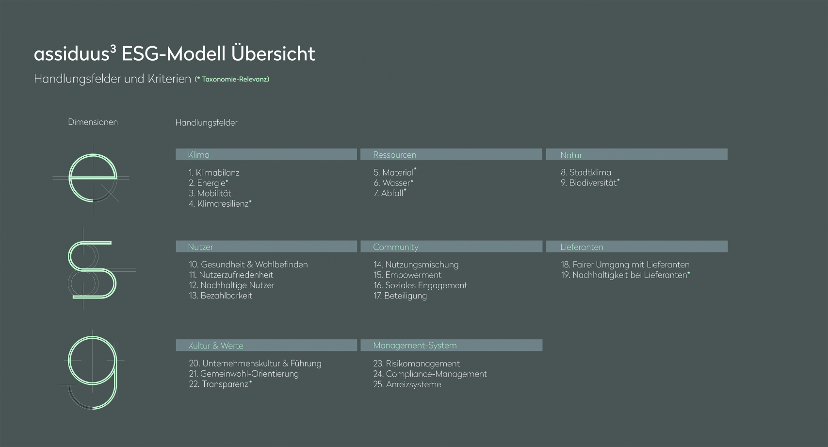 Unser Verständnis verantwortungsvoller Projektentwicklung haben wir in das assiduus³ ESG Impact-Modell für Immobilien übersetzt. Es bildet ESG ganzheitlich in 25 klar definierten Kriterien ab und ist strategische Grundlage für die Entwicklung unserer Immobilienprojekte.